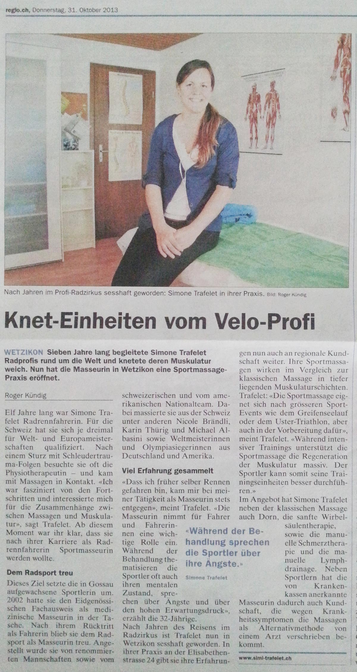 Seit Juni 2013: Selbständig in meiner eigenen Praxis Simi Trafelet – Sportmassage, die bewegt, in Wetzikon, wo ich vor allem Halbprofi- und ambitionierte Hobbysportler massiere. Bericht dazu in der Lokalzeitung Regio.